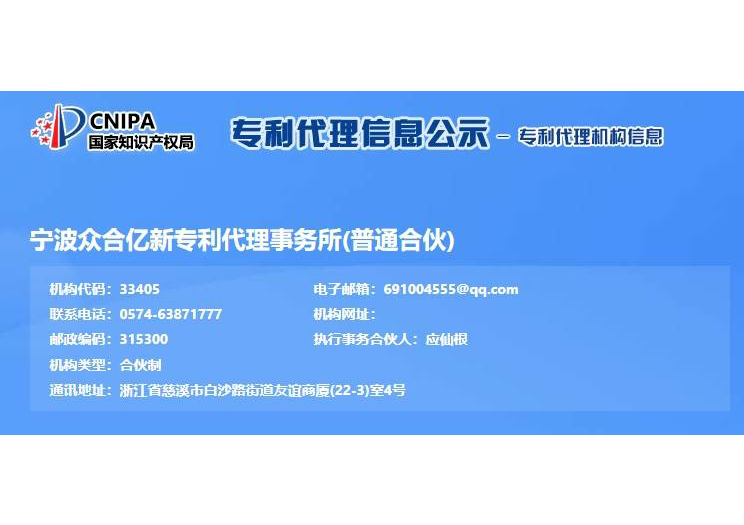 浙江億新知識產(chǎn)權(quán)服務(wù)有限公司前身為慈溪眾合知識產(chǎn)權(quán)代理事務(wù)所,創(chuàng)始于2004年,為了服務(wù)更多的創(chuàng)新企業(yè),實(shí)現(xiàn)“服務(wù)億萬創(chuàng)新企業(yè)”的理念,后更名為浙江億新知識產(chǎn)權(quán),旗下公司包括:寧波眾合億新專利代理事務(wù)所(機(jī)構(gòu)代碼33405)、中范(北京)認(rèn)證有限公司。其中寧波眾合億新專利代理事務(wù)所是慈溪市科技服務(wù)聯(lián)盟理事單位,前灣區(qū)知識產(chǎn)權(quán)工作站。公司位于浙江省慈溪市文化商務(wù)區(qū)友誼商廈,并在北京、青島設(shè)有辦事處。